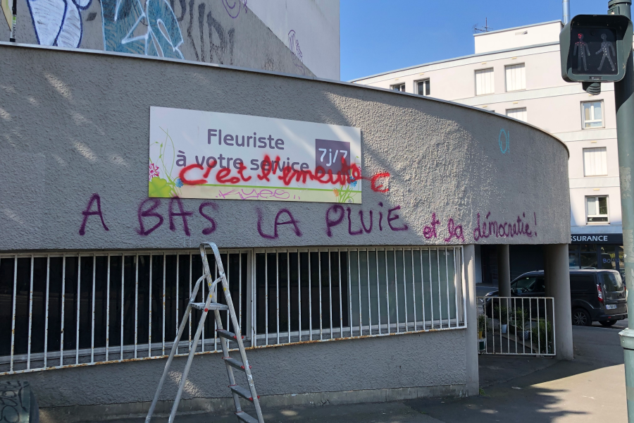 Le rassemblement avait été interdit par la Préfecture. Cela n'a pas empêché plus de 200 personnes proches de l'ultra-gauche rennaise de se réunir dimanche soir, peu après l'annonce des résultats de l'élection présidentielle. Ils entendaient protester contre l'élection d'Emmanuel Macron. Evacués de la place Saint-Anne par les forces de l'ordre, les manifestants se sont repliés sur les rues adjacentes, dans le secteur du Vieux Saint-Etienne et la rue de Dinan, où des feux ont été déclenchés et de nombreux murs d'immeubles tagués. Repoussés par les forces de l'ordre, ils se sont ensuite repliés vers les prairies Saint-Martin et le quartier de la Bellangerais. Ce matin, le quartier porte les stigmates de la manifestation.